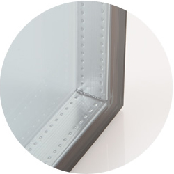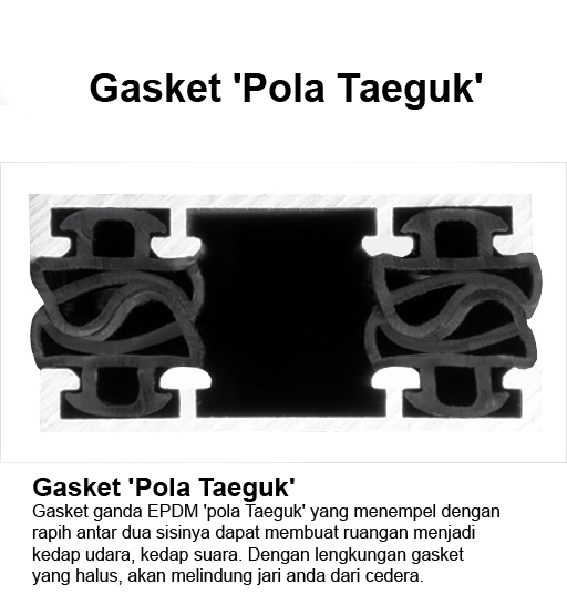 Gasket ganda EPDM ‘pola Taeguk’ secara sempurna memotong celah antar pintu. Sehingga menjadi kedap suara, tahan angin dan insulasi (tahan cuaca). Selain itu, bentuk lengkung lembut dari pola taeguk melindungi jari agar tidak terluka pada saat terjepit pintu.